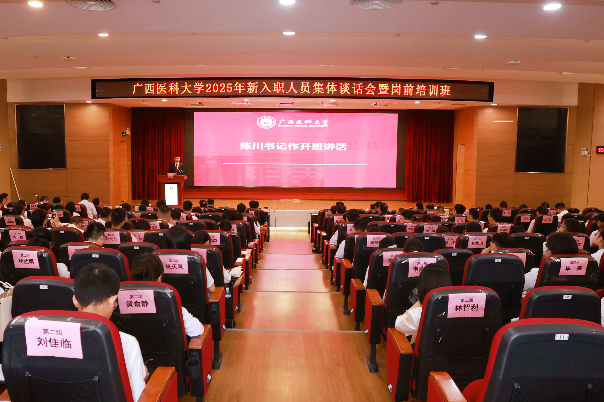 为深入贯彻落实立德树人根本任务,加强新时代高素质专业化教师队伍建设,9月15日上午,广西医科大学2025年87名新入职人员集体谈话会暨岗前培训班在南宁-校本部科技楼报告厅举行。校党委书记陈川、校长曾志羽出席开班仪式。开班仪式由副校长卢德成主持。